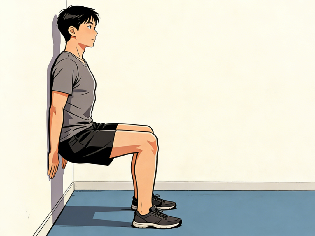 背靠墙壁,双脚与肩同宽,脚尖朝前,脚跟离墙约一脚半的距离。沿墙壁缓慢向下滑动,直到大腿与地面平行(如感觉困难,可蹲得浅一些)。注意保持腰背紧贴墙壁,膝盖与脚尖方向一致,不要内扣。
